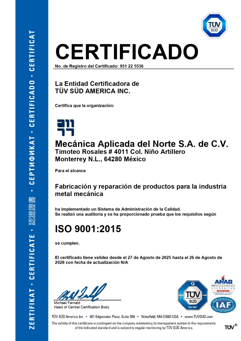 En Mecánica Aplicada del Norte fabricamos y reparamos productos dirigidos a la industria metal- mecánica cumpliendo los compromisos de los requerimientos y expectativas de nuestras partes interesadas, objetivos de la calidad y la mejora continua del sistema de gestión de la calidad.